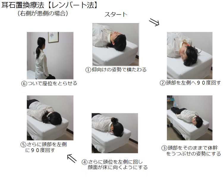 医師が眼振を観察しながら、手で頭を動かして、はずれた「耳石」を、元に戻す理学的治療です。5分間位、椅子の上やベッド上で、頭を決められた位置や方向に動かして行います。