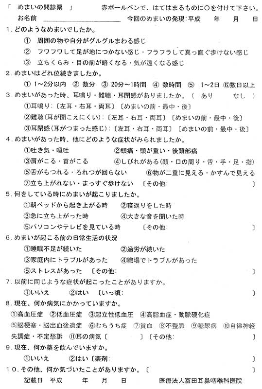 H 治療:この病気はストレス、過労、睡眠不足などの生活習慣が悪影響し、三半規管の「内リンパ水腫」、すなわち「むくみ」をきたすことで起こります。生活面で、ストレス、過労、睡眠不足などを軽減するように気をつけることが、一番大事です、すなわち「生活改善」が必要です。 めまいのお薬では、なかなか効果はありません。めまいの原因を根本的に治してくれないからです。私は、お薬は普通処方いたしません。 治療で大切なのは、この「くたびれ」を解消することが一番です。ストレス、過労、睡眠不足からくる精神的「くたびれ」と肉体的「くたびれ」を解消するためには、次の三つが大切です。